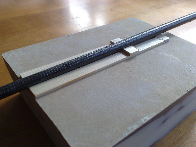 Bei der Flügeltiefe von 180mm ergibt die 3mm Unterlage durch die Querstrebe eine Einstellwinkeldifferenz von 1°. Auf die Flügelaufnahme außen rechts und links 3mm breite 3mm-Balsastreifen zur Aufnahme der V-Form des Flügels kleben.