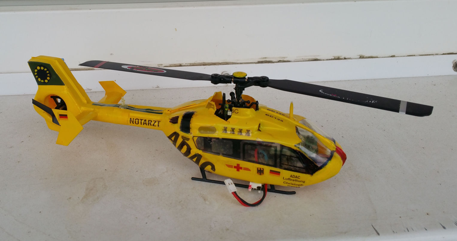Hallo Herr Causemann, habe meinen Heli ERix 150 3D mit Ihren Rumpfbausatz EC 135 fertiggestellt, das ganze als ADAC Heli, anbei paar Bilder , selbst Antennen habe ich aus kleinen Plastkröhrchen aus Ohrtupfer aufgeklebt und die Aufkleber selbst nach Vorbilder entworfen und ausgeschnitten und angebracht, hoffe Ihnen gefallen die Bilder , Video vom Erstflug folgt, muß noch den Schwerpunkt korrekieren, Bilder als Anhang, auch Bild Heli vorm Umbau und nach den Umbau, Gruß Steffen Werning
