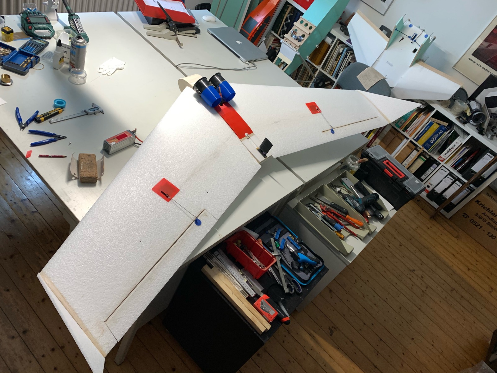 Nurflügler ...Rohbau fertig, Daten: Spannweite 2100 mm, Antrieb 2x Impeller 70mm, 2x80 A Regler Akku 6S, Bauweise: Schaumteile, Sperrholz 3,2 mm, 3D Druckteile PLA, Gewicht 2500 g Flächenbelastung 27 g/dm2, Flügel und Rumpfteile Jochen Causemann (einfach super),