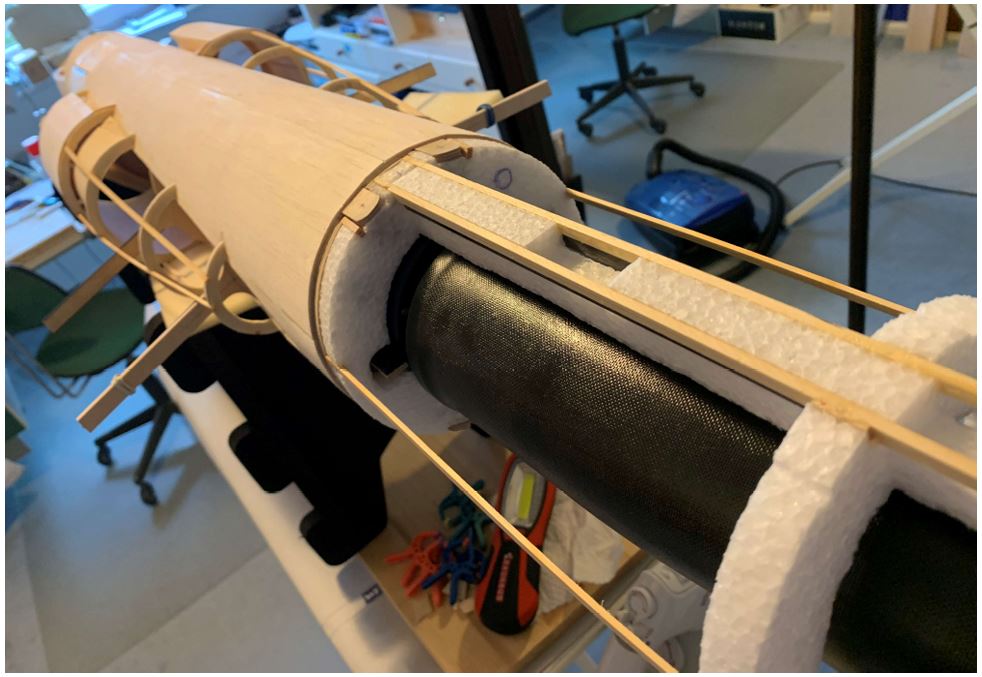 Während der Bauphase habe ich festgestellt, dass Depron nicht unbedingt „mein Werkstoff“ ist. Ich habe daher spontan beschlossen, eine Gemischtbauweise anzuwenden. Habe daher den Rumpf und die Tragflächen mit Balsa beplankt. Dazu habe ich die Einlässe etwas größer gestaltet. Das Modell wird natürlich etwas schwerer, ich werde bei ca. 2,8 kg landen. Ich denke, das müsste noch ok sein.
