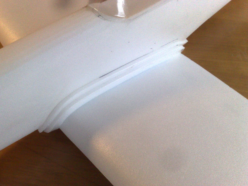 Für die Rumpfanformung 2 Streifen Depron 6mm, 1 x 15mm breit, der zweite 10mm breit, an den Rumpf kleben. ACHTUNG: sparsam mit dem Uhu Por, NICHT die Flächen verkleben, nur am Rumpf Klebstoff auftragen.